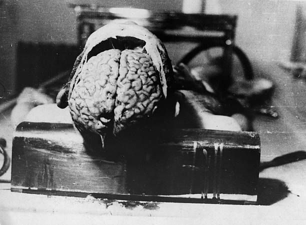 The autopsy specimen of the brain of a Dachau victim, the experiments were conducted in an attempt to simulate high-altitude conditions. Victims were placed in a low-pressure chamber and then strangled under water to simulate drowning. This type of experimentation was meant to gather data on how the human body would react to high-altitude conditions, such as those experienced by pilots during air raids.