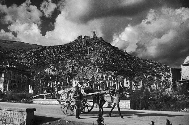 The ruins of Cassino in Italy, after World War II, with Castle Hill in the background, 1946. The town was destroyed by the Allies during the Battle of Monte Cassino (Jan – May 1944).