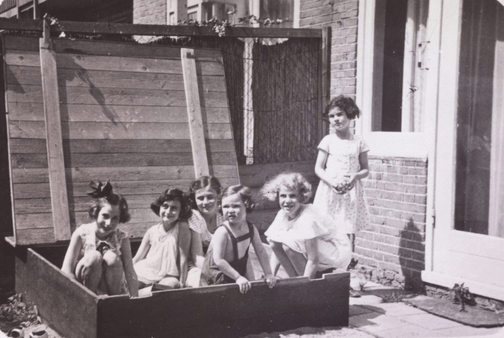 Left to right: Hanneli Goslar (a.k.a., “Lies Goosens” in early editions of the Diary), Anne Frank, Dolly Citroen, Hannah Toby, Barbara Ledermann and Susanne Ledermann (standing), Amsterdam, 1937.