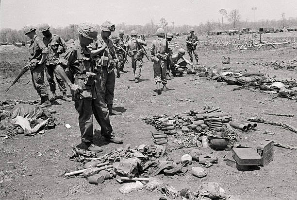 Soldiers of the 173rd Airborne Brigade with weapons and bodies of the enemy captured during Operation Junction City in Tay Ninh, Vietnam. The operation was a military campaign conducted by the United States during the Vietnam War with the aim of disrupting the enemy’s operations in the region. The captured weapons and bodies of the enemy soldiers likely represent the success of the operation.